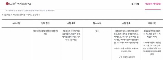 LG유플러스 '익시오' 서비스의 개인정보 처리방침. AI 서비스 데이터 백업을 위해 6개월 동안 통화 요약본을 저장하고, 서비스 품질 향상을 위해 구글과 AWS, 마이크로소프트 등에 통화전문 내용을 이전하고 있었다. |