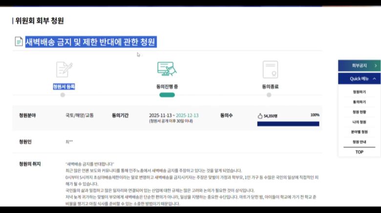 청원인은 자신을 맞벌이 주부라고 밝히며 새벽 배송은 맞벌이 부모에게 일상을 지탱하는 필수 수단이라고 호소했습니다.