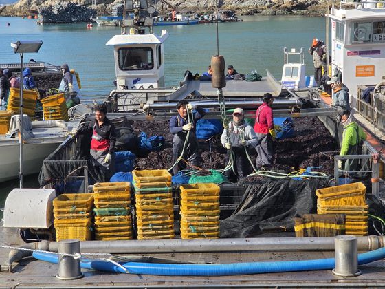 지난달 29일 오전 전남 완도군 당인리 위판장에서 외국인 근로자들이 김 채취선에 올라 물김을 나눠담는 작업을 하고 있다. 최경호 기자 |