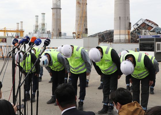 김완석 HJ중공업 대표이사가 지난달 13일 울산화력본부 보일러 타워 붕괴사고 현장 앞에서 대국민 사과를 하고 있다. 뉴스1