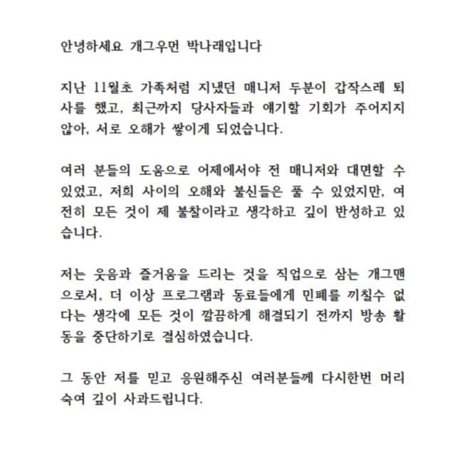 저는 웃음과 즐거움을 드리는 것을 직업으로 삼는 개그맨으로서, 더 이상 프로그램과 동료들에게 민폐를 끼칠수 없다는 생각에 모든 것이 깔끔하게 해결되기 전까지 방송 활동을 중단하기로 결심하였습니다.