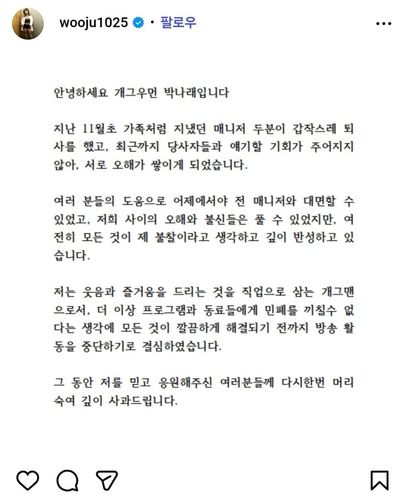 그는 이어 "웃음과 즐거움을 드리는 것을 직업으로 삼는 개그맨"이라며 "더 이상 프로그램과 동료들에게 민폐를 끼칠 수 없다"고 덧붙였다.