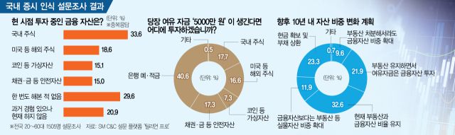 8일 서울경제신문이 SM C&C 설문조사 플랫폼 ‘틸리언프로’를 통해 이달 1~3일 전국 20~60대 1505명을 대상으로 설문 조사한 결과 ‘당장 여유 자금 5000만 원이 생기면 어디에 투자하겠느냐’라는 질문에 40.6%가 ‘은행 예적금’을 선택한 것으로 집계됐다. 채권·금 등 안전자산(17.3%)까지 합치면 절반 이상이 원금이 보장되는 금융자산을 선택했다.