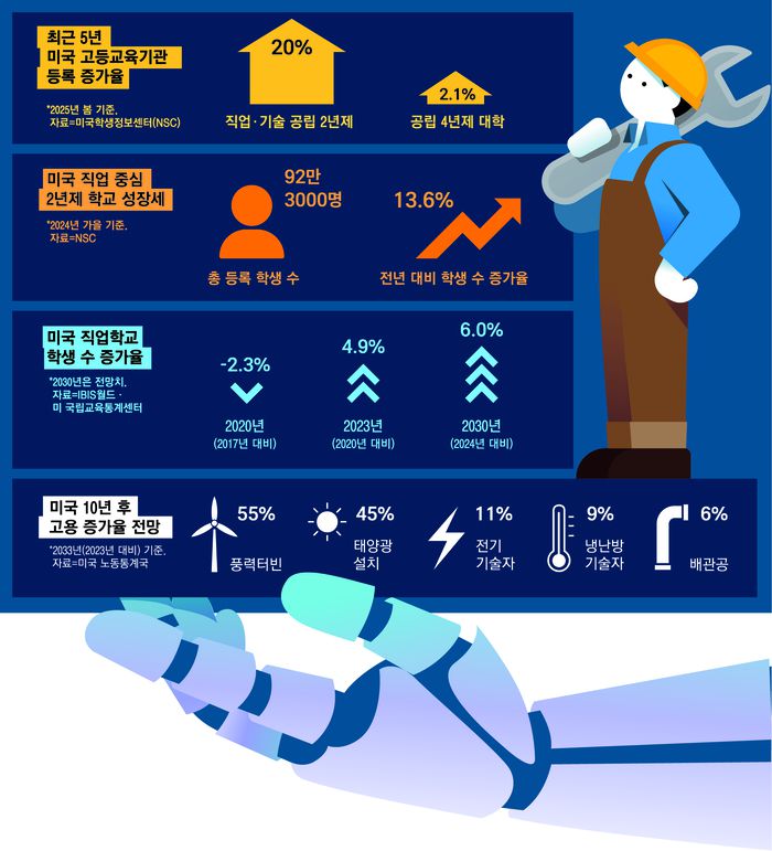 채용 플랫폼 블루리크루트의 3분기 보고서에 따르면 지난 1년간 전체 산업 평균 임금상승률은 3.9%에 그쳤지만, 건설 현장 일반 노동자(16%), 자동차 정비 기술자(10%), 전기 기술자(5%) 등은 큰 폭의 상승세를 기록했다. 일부 냉난방공조(HVAC) 기술자의 상위 10% 연봉은 9만달러를 넘어서며 인문계열 대졸자의 소득을 상회한다. “대학 안 가고 기술 배우는 게 낫다”는 말이 경제적 실리가 된 셈이다.