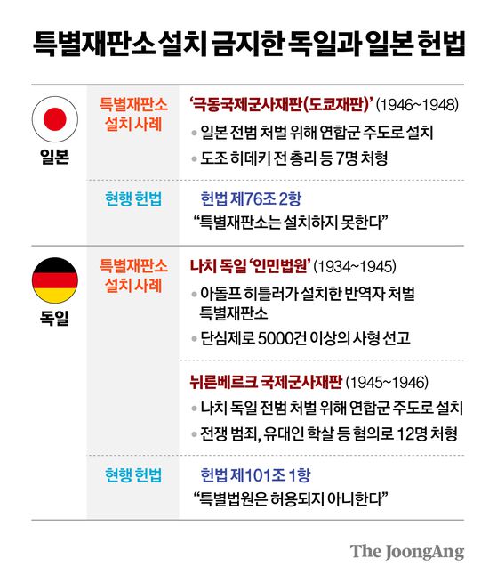 실제로 독일과 일본은 헌법에 각각 “특별법원은 허용되지 않는다”(101조 1항) “특별재판소를 설치할 수 없다”(76조 2항)고 규정해 뒀다. ‘특별법원’에 대해 독일 헌법 주석서는 “행정부가 법적 관할권과 달리 특별히 구성하고 개별적으로 지정된 사건을 판결하도록 부름 받은 법원을 의미한다”고 해석한다. 특별재판부의 본질은 구성 방식이 아니라 “지정된 사건을 판결한다”는 목적에 있다는 뜻이다.