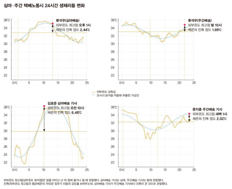 기자의 심야배송 5일차 피부온도의 최고점은 새벽이 아니라 오후 1시18분이었다. 김 교수는 “심야 활동과 수면 부족으로 생체시계가 뒤틀릴 때 나타나는 전형적인 형태”라고 설명했다. 고정 주간배송을 하는 쿠팡 기사 문지훈(46·가명)씨는 피부온도의 최고점이 자정~새벽 1시로 관찰돼, 기준 시점(새벽 3~5시)과 2시간 정도 차이 날 뿐 리듬은 비교적 안정적이었다.