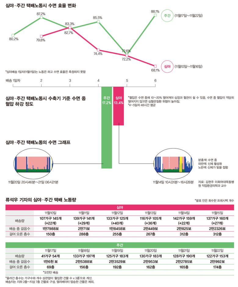 한겨레21 류석우 기자는 쿠팡 심야배송 노동이 몸에 어떤 변화를 일으키는지 직접 확인하기 위해 2025년 11월10일부터 22일까지 2주 동안 쿠팡 택배기사와 동일한 일정으로 일했다. 첫 주 6일은 밤 9시에 출근해 이튿날 아침 6~7시까지 심야배송을 했고, 하루 쉰 뒤 아침 7시30분부터 저녁 7~8시까지 주간배송 6일을 연속으로 경험했다. 류 기자는 신체 변화 측정을 위해 24시간 활동혈압계, 수면을 기록하는 액티그래프, 피부온도를 측정하는 바이탈링을 착용했다. 택배기사들은 업무 특성상 활동혈압계를 착용할 수 없어 수면 및 피부온도만 측정했다. 모든 생체 신호는 직업환경전문의 김현주 이화여대목동병원 교수의 조언을 받아 분석했다.