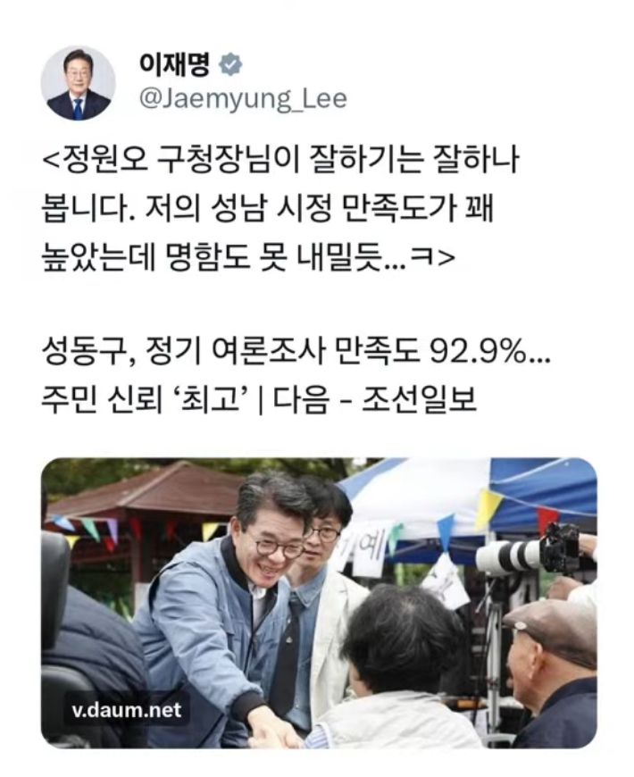 ◇ 김현정> 그렇게 보시는군요. 근데 어제 이재명 대통령은 SNS에다가 정원오 성동구청장에 대한 칭찬의 글을 올려서 지금 저희가 보여드리고 있는데 굉장히 화제가 됐어요. 뭐라고 쓰셨냐면 '정원오 구청장님이 잘하기는 잘하나 봅니다. 저의 성남시정 만족도가 꽤 높았는데 명함도 못 내밀 듯 크' 여기까지 하면서 그 성동구 정기 여론조사 만족도가 실린 기사를 링크까지 걸어서 대통령이 굉장히 이례적으로 칭찬을 하다 보니까 정원오 구청장이 대통령 픽인가? 이런 얘기가 막 돌았어요, 어제 세간에. 알고 계시죠?