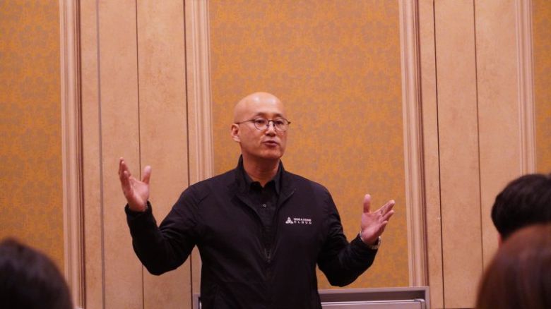 염동훈 메가존클라우드 대표가 현지시각 지난 3일 미국 라스베이거스 'AWS 리인벤트' 현장에서에서 기자간담회를 갖고 내년 미국 사업계획과 전략에 대해 소개하고 있다. AWS 제공 |