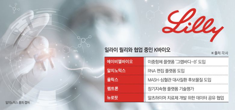 9일 바이오 업계에 따르면 릴리는 에이비엘바이오, 올릭스, 펩트론, 알지노믹스, 뉴로핏, SK팜테코 등 국내 주요 바이오 기업과 협업 체계를 구축하고 있다. 릴리는 비만·당뇨 치료제 ‘마운자로’와 ‘젭바운드’로 잘 알려진 글로벌 톱10 제약사로 최근 제약·바이오 기업 최초로 시가총액 1조 달러(약 1400조 원)를 돌파하며 존재감을 강화했다.