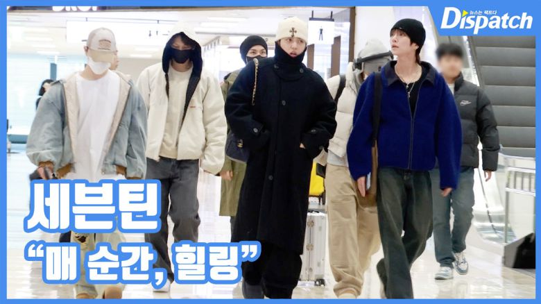 '세븐틴(SEVENTEEN)' 에스쿱스, 조슈아, 준, 도겸, 버논, 디노가 힐링되는 비주얼로 출국길에 나섰다.
