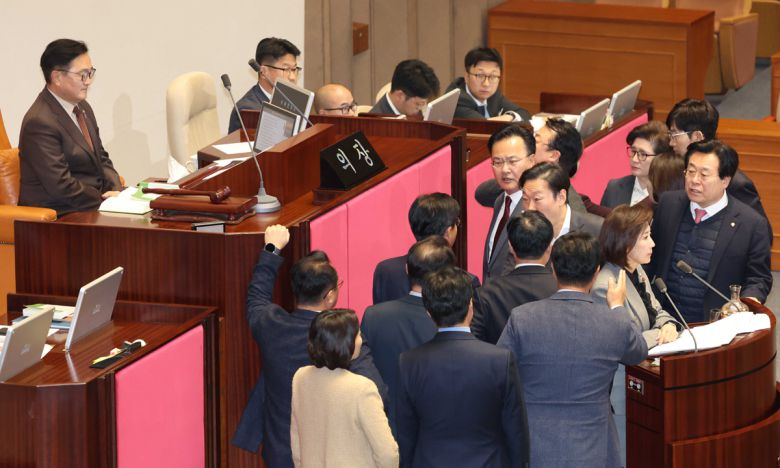 여아가 올해 정기국회 마지막 날인 그제 오후 본회의에서 정면 충돌했다. 필리버스터(무제한 토론을 통한 합법적인 의사진행 방해) 첫 주자로 나선 국민의힘 나경원 의원과 우원식 국회의장 간 신경전이 결국 몸싸움으로 번졌다. 우 의장이 의제와 관련 없는 발언으로 의사진행을 방해했다며 13분 만에 나 의원의 마이크를 끄도록 조치하자 국민의힘 의원들이 연단으로 몰려나와 고성을 지르며 거세게 항의했다. 더불어민주당 의원들이 야유를 보내며 아수라장이 됐고, 우 의장은 정회를 선포했다. 이후 국민의힘 의원들이 항의 방문차 국회의장실로 밀고 들어가는 과정에서 국회 관계자와 몸싸움이 벌어졌다. 어제부터 시작된 임시국회에서도 이런 극한 대치가 이어질 게 뻔한데 참담한 심정이다.