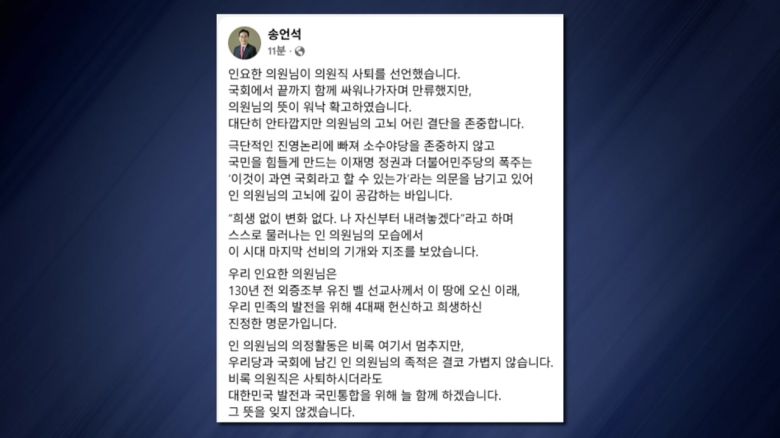 이어 의정활동은 비록 여기서 멈추지만, 인 의원이 당과 국회에 남긴 족적은 결코 가볍지 않다면서, 사퇴하더라도 대한민국 발전과 국민 통합을 위해 늘 함께하고 그 뜻을 잊지 않겠다고 밝혔습니다.
