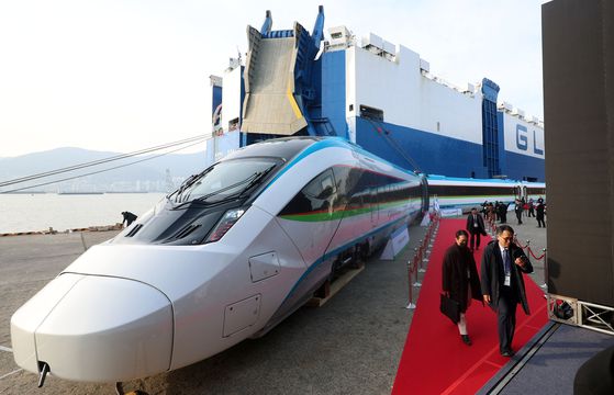 국산 고속철의 첫 해외 수출인 ‘우즈베크 고속차량 초도 편성 출항식’이 10일 경남 창원시 마산항에서 열렸다. 현대로템이 현지에 공급하는 우즈베크 고속차량은 총 42량(1편성당 7량)으로 1286㎞ 달하는 장거리 노선에 투입될 예정이다. [연합뉴스]