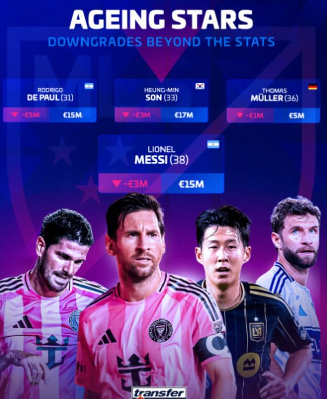 레버쿠젠 시절 몸값이 된 손흥민과 함께 리오넬 메시, 로드리고 데 폴, 토마스 뮐러 몸값도 나란히 하락했다. 메시는 이번 시즌 MLS 득점왕, MLS컵 MVP, MLS MVP를 석권하고 인터 마이애미 MLS컵 우승까지 이끌었는데 300만 유로가 감소해 기존 1,800만 유로(약 311억 원)에서 1,500만 유로(약 259억 원)가 됐다.