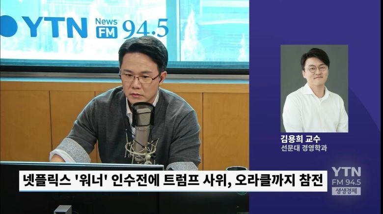◆ 조태현 : YTN 라디오 생생경제 2부로 이어가겠습니다. 요즘 글로벌 미디어 업계가 상당히 시끄럽습니다. 넷플릭스와 파라마운트가 할리우드의 심장이라고 할 수 있는 워너브러더스디스커버리를 놓고 벌이는 초대형 인수전이 일파만파 커지고 있습니다. 여기에 이렇게 큰돈이 오가는 데 꼭 빠지지 않는 사람이 있죠. 트럼프까지 끼어들면서 더욱 복잡한 상황이 되고 있습니다. 오늘은 이 이야기 자세히 나눠보겠습니다. 선문대학교 경영학과 김용희 교수님 연결돼 있습니다. 교수님 나와 계십니까?