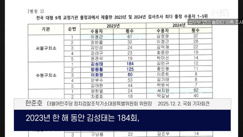 “2023년 한 해 동안 김성태는 184회, 이화영은 60회 검사 조사 출정을 했는데, 이는 전국 대형 교정시설 중 최다 또는 최상위 수준입니다. 휴일 조사 때는 이들에게 육회덮밥, 회덮밥, 갈비탕, 삼계탕, 고급 도시락과 커피·햄버거·과자 등이 반복 제공되었습니다.” (한준호 위원장, 12월 2일 국회 기자회견)