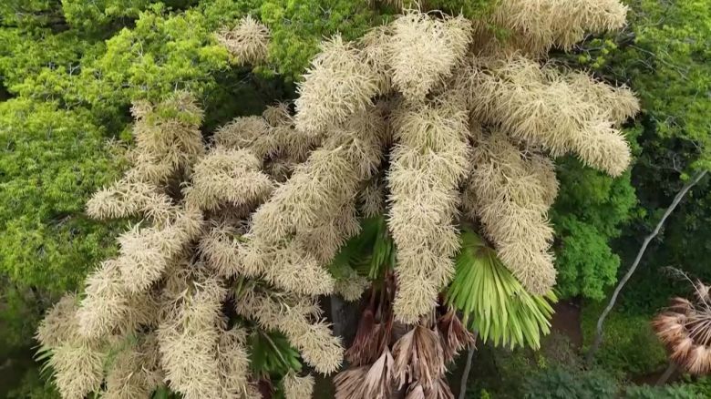 높이가 20m를 훌쩍 넘는 이 야자나무는 놀랍게도 일생에 단 한 번만 꽃을 피웁니다.