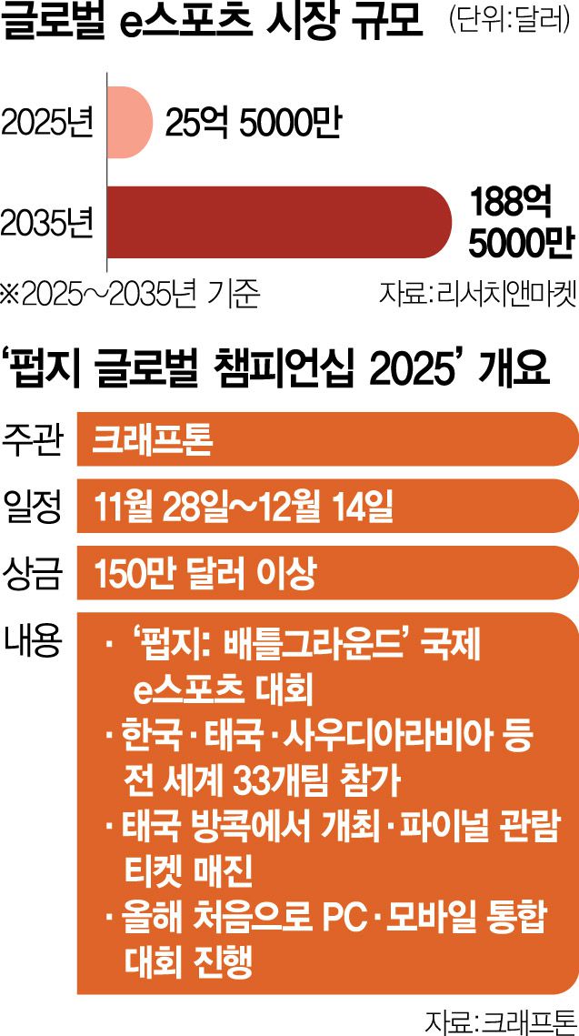 글로벌 시장조사 기관 리서치앤마켓에 따르면 전 세계 e스포츠 시장 규모는 올해 25억 5000만 달러(약 3조 7676억 원)에서 2035년 188억 5000만 달러(약 27조 8508억 원)까지 성장할 것으로 전망된다. 이 기간 예상 연 평균 성장률은 19.95%에 달한다.