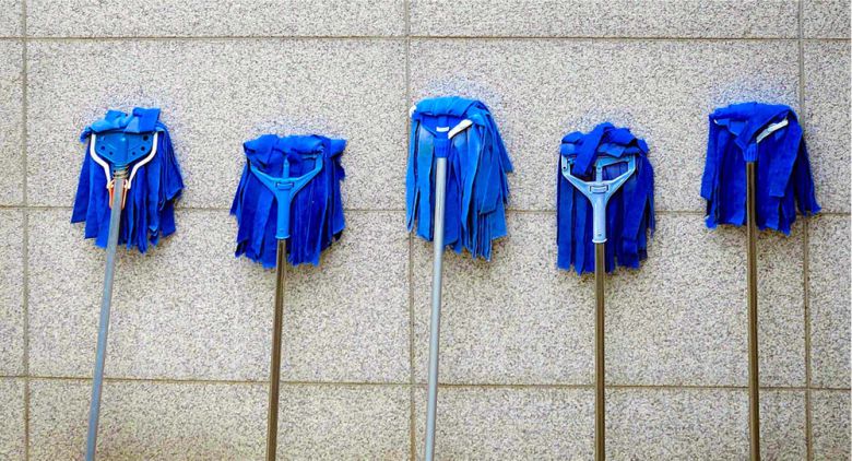 여기저기 바닥에서 바쁘게 움직였던 걸레들이 벽에 기대 잠시 쉬는 듯합니다. 우리가 느낀 아침의 깨끗함에서 밤새 움직이며 더러운 곳을 닦았을 걸레의 노고가 느껴집니다.  김재훈 기자