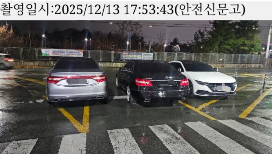 [서울=뉴시스]한민아 인턴 기자 = 주말 밤 교차로 한복판을 가로막은 불법주차 차량들이 공개되며 공분을 사고 있다. 좌회전 차로 초입에 차량 3대가 줄지어 세워지면서, 차로 자체가 사실상 봉쇄되는 황당한 일이 벌어졌다.