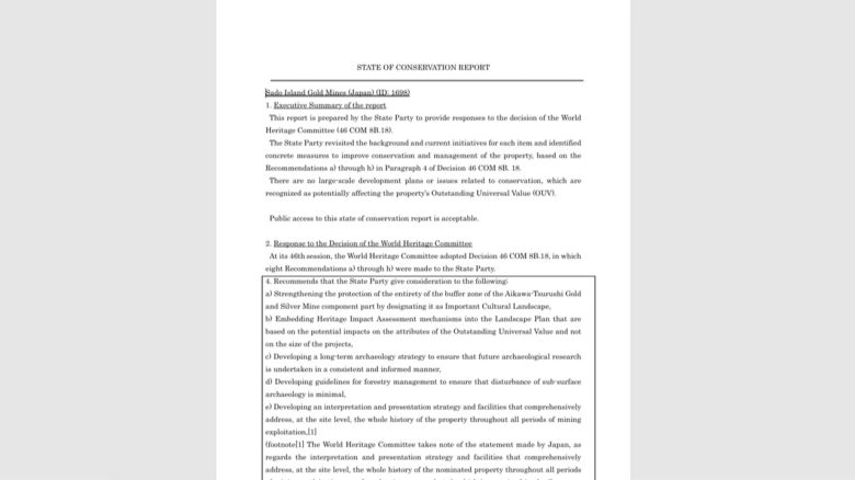 세계유산위원회가 홈페이지를 통해 공개한 보고서를 보면, 일본은 지난해 7월 사도광산의 세계문화유산 등재 당시 권고받은 8개 사항의 이행 결과를 기술하면서 조선인 강제노역 사실을 알리는 내용을 포함하지 않았습니다.