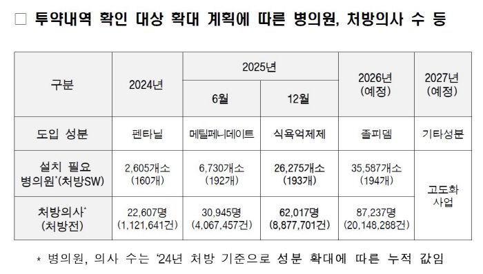 식품의약품안전처와 한국의약품안전관리원은 일명 '의료쇼핑' 행위 등 마약류 오남용을 방지하기 위해 의사가 환자의 과거 1년간 의료용 마약류 투약내역을 마약류통합관리시스템(의료쇼핑방지정보망)을 통해 확인하여 적정하게 처방할 수 있도록 하는 '의료용 마약류 투약내역 확인 제도' 대상 성분을 확대(권고)한다.