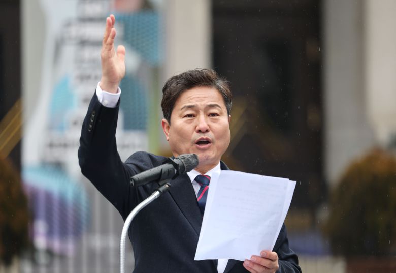 김영배 더불어민주당 의원이 16일 서울 중구 문화역서울284 앞에서 서울시장 선거 출마를 선언하고 있다. 연합뉴스 |