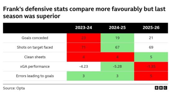 현재 프랭크와 부진했던 2024-2025시즌 포스테코글루 감독의 리그 스탯을 비교한 BBC는 공격 지표와 수비 지표에서 차이가 있다고 설명했다.