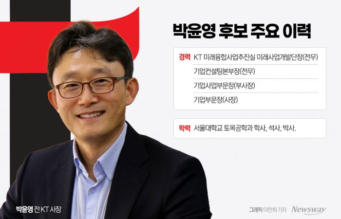 [뉴스웨이 강준혁 기자]KT가 '30년 KT맨' 박윤영 전 기업부문장(사장)을 차기 최고경영책임자(CEO) 최종 후보로 낙점했다. 구현모 전 대표에 이어 두 번째 내부 출신 대표 선발이다. 이를 두고 업계에서는 '정치권 낙하산' 논란을 피하고 '통신 전문가'를 택하면서 실리를 취했다는 평가가 나온다.