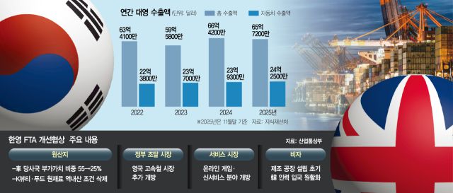 또 다른 주요 성과 중 하나는 자동차 및 K뷰티·푸드의 원산지 기준이 완화됐다는 점이다. 특히 대영국 수출의 3분의 1 이상을 차지하는 자동차는 이번 개선 협상을 통해 수출 확대 기반을 마련할 수 있게 됐다. 기네스 맥주, 스코틀랜드산 연어 등 영국산 식품 수입도 늘어날 것으로 예상된다.