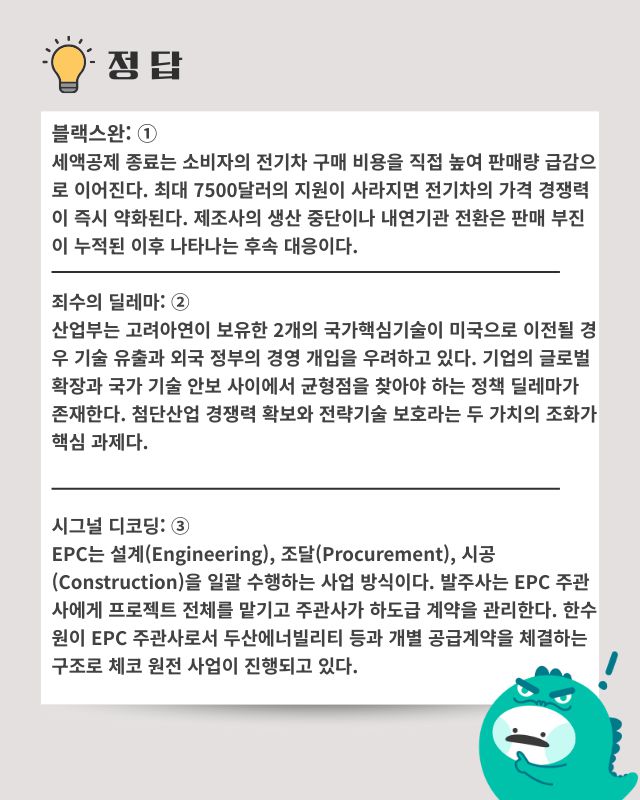■ 두산 원전 수주: 두산에너빌리티가 체코 원전 프로젝트에서 5조6000억 원 규모의 원자로 주기기와 터빈 공급 계약을 체결했다. 한국수력원자전력이 주도하는 체코 원전 사업에서 두산에너빌리티가 핵심 설비 공급사로 선정되며 원전 수출의 새로운 이정표를 세웠다.