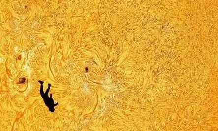 순위를 매기지는 않았지만 네이처가 가장 먼저 소개한 사진은 한 스카이다이버가 이글거리는 태양 표면을 배경으로 완벽한 실루엣을 만들어낸 장면이다. 배경에 있는 흑점은 주변보다 온도가 낮다. 태양 활동이 활발해지면서 강력해진 자기장이 열 전달을 막아 생기는 현상이다.