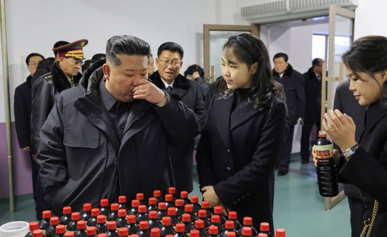 김정은 북한 국무위원장이 지난 15일 평양시 강동군 지방공업공장·종합봉사소 준공식에 참석해 식료공장에서 식료품을 시음하고 있다. 이날 행사에는 아내 리설주(맨 오른쪽)와 딸 주애(김정은의 오른쪽)도 동행했다. 북한 매체들은 16일 김정은 부녀의 행사 사진을 대량 공개했는데, 그중에는 공장 건물로 들어갈 때 김정은보다 앞서 걷는 주애의 모습도 있었다.