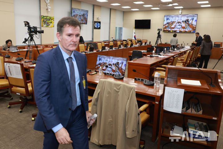 [서울=뉴시스] 고승민 기자 = 브랫 매티스 쿠팡 CISO가 2일 서울 여의도 국회에서 열린 과학기술정보방송통신위원회의 쿠팡 개인정보 유출 사고 관련 현안질의에서 정회 후 회의장을 나서고 있다. 2025.12.02. kkssmm99@newsis.com