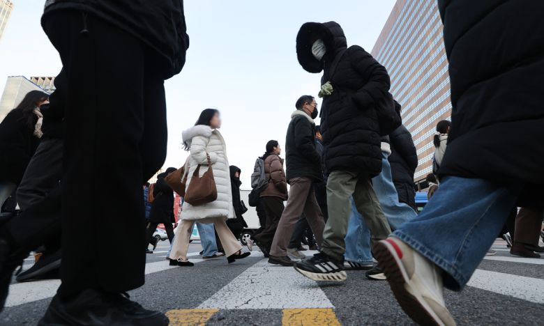 서울 종로구 광화문네거리에서 패딩 등 외투를 입은 직장인들이 출근하고 있다. 연합뉴스