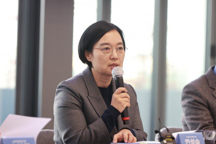 [서울=뉴스핌] 한성숙 중소벤처기업부 장관이 20일 서울 강남구 씨스퀘어에서 열린 '소상공인 성장 제1차 릴레이 간담회'에서 인사말을 하고 있다. [사진=중소벤처기업부] 2025.11.20 photo@newspim.com