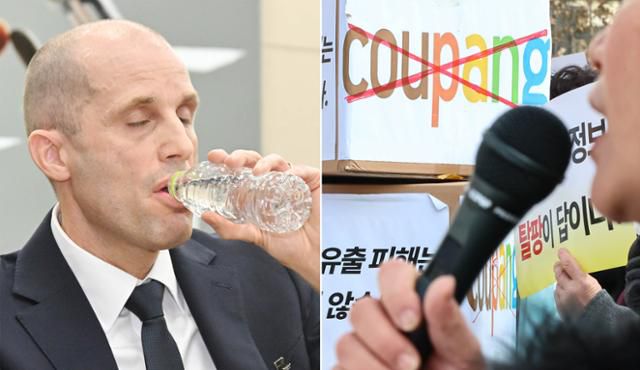 해럴드 로저스 쿠팡 대표이사가 17일 국회 과학기술정보방송통신위원회에서 열린 쿠팡 침해사고 관련 청문회에 출석해 물을 마시고 있다(왼쪽 ). 이날 한국소비자단체협의회 회원들이 서울 종로구 보신각 앞에서 쿠팡 탈퇴 소비자행동 발대식을 하고 있다. 민경석 기자 뉴스1