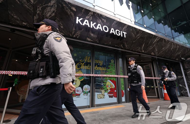 지난 15일 오후 경기 성남시 분당구 카카오 판교 아지트에서 경찰 관계자들이 건물을 통제하고 있다. 이날 카카오 사옥에 폭발물을 설치했다는 협박성 메시지가 접수돼 카카오는 전 직원을 재택근무로 긴급 전환했다. 2025.12.15/뉴스1 ⓒ News1 구윤성 기자