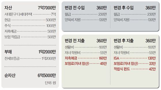 ◆자녀 자산은 장기 투자, 보험은 구조조정=S&P500지수나 나스닥100지수처럼 장기 성과가 검증된 지수에 적립식으로 투자하면 변동성을 완화하며 자산을 늘릴 수 있다. 중요한 것은 수익률 예측이 아니라, 매달 투자가 중단되지 않도록 현금 흐름을 유지하는 것이다. 보험 점검도 병행하자. 의뢰인은 2인 가구 기준 월 45만원, 총 20건의 보험을 유지 중인데 보장 기간이 짧거나 보장 내용이 겹치는 상품 비중이 높아 보험료 대비 효율이 낮다. 치아보험 등 활용도가 낮은 상품은 정리해 고정비를 줄이고, 실손보험은 단독 상품으로 단순화해 향후 보험료 인상 부담을 관리하는 편이 좋겠다. 종신보험은 실손과 분리해 가장의 사망 위험에 집중하자. 보장이 부족하면 자녀 성장기 동안 정기보험으로 보완하는 전략이 합리적이다.