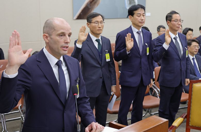 국회 과학기술정보방송통신위원회(과방위)가 3370만명의 개인 정보 유출로 논란이 된 쿠팡에 대한 청문회를 17일 열었다. 하지만 쿠팡 창업자이자 실질적인 오너인 김범석 쿠팡Inc 의장과 최근까지 쿠팡을 이끌었던 박대준 전 대표 등 핵심 인사들은 불출석했다. 대신 한국어를 못하는 미국인인 해롤드 로저스 쿠팡 임시 대표가 출석했다. 사진은 로저스 대표가 국회 과방위 청문회에서 증인 선서를 하는 모습. /남강호 기자