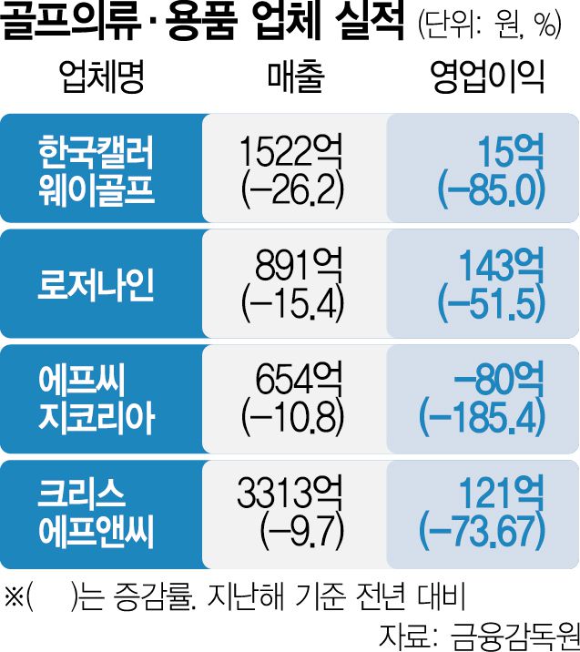 주요 골프의류 업체들의 실적도 하락세를 보이고 있다. 한국캘러웨이골프의 지난해 매출은 1522억 원으로 전년 대비 26.2% 줄었다. 같은 기간 영업이익은 85% 감소한 15억 원에 그쳤다. PXG를 운영하는 로저나인과 와이드앵글을 운영하는 에프씨지코리아 역시 지난해 매출이 각각 15.4%, 10.8% 줄었다. 파리게이츠와 핑, 세인트앤드류스 등의 브랜드를 보유한 크리스에프앤씨(110790)는 2022년부터 지난해까지 매년 매출 감소세를 나타냈다.
