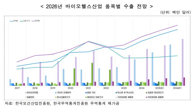 한국보건산업진흥원은 18일 '바이오헬스 산업 수출 2025년 동향 및 2026년 전망' 보고서를 통해 내년 수출액이 올해 대비 9.0% 증가한 304억 달러(약 44조 9000억 원)에 달할 것으로 전망했다. 아시아·태평양 중심 수출 구조에서 벗어나 미국·유럽에서 입지가 강화되면서 역대 최대 실적을 경신할 것으로 내다돴다.