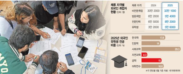 국가데이터처가 18일 발표한 ‘2025년 이민자 체류 실태 및 고용 조사’에 따르면 올해 5월 기준 국내에 상주하는 외국인은 총 169만 2000명으로 전년 대비 13만 2000명(8.4%) 늘었다. 체류 자격별로는 외국인 유학생이 23만 6000명으로 전년(20만 명) 대비 18.2% 늘었다. 외국인 유학생이 23만 명을 넘은 것은 이번이 사상 처음이다. 이 밖에 전문 인력 비자와 영주 비자가 각각 8만 2000명과 16만 3000명으로 전년 대비 25.1%, 15.1% 증가했다.