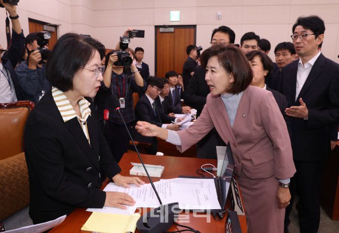 [이데일리 노진환 기자] 추미애 법제사법위원장이 22일 오전 서울 여의도 국회에서 열린 법제사법위원회 전체회의에서 질서유지권 발동에 항의하는 나경원, 곽규택 국민의힘 의원 등을 제지하고 있다. 이날 열린 법사위 전체회의에서 국민의힘 의원들은 회의 시작 전 의원석 노트북에 부착한 피켓을 철거하라는 추 위원장의 발언을 거부했다. |