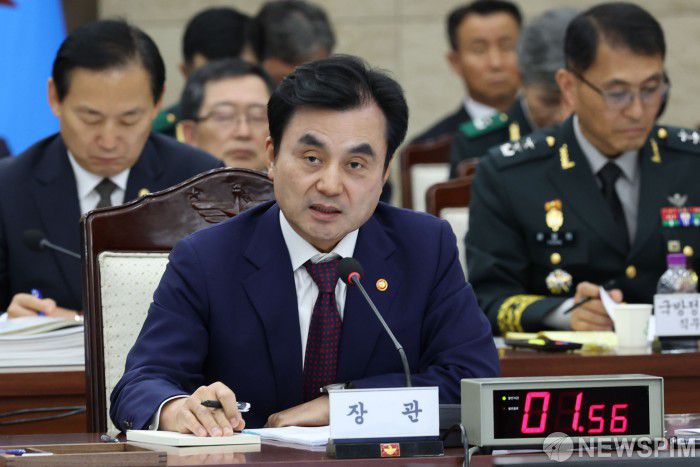 [서울=뉴스핌] 국회사진기자단 = 안규백 국방부 장관이 13일 오후 서울 용산구 국방부 청사에서 열린 '2025 국방부 국정감사'에서 의원들의 질의에 답하고 있다. 2025.10.13 photo@newspim.com |