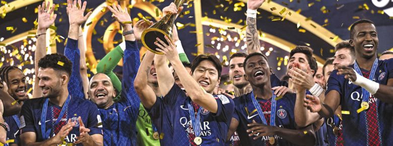프랑스 파리 생제르맹(PSG)의 이강인(가운데)이 17일 카타르에서 열린 FIFA 인터콘티넨털컵 결승에서 브라질 플라멩구를 꺾고 우승한 뒤 트로피를 들어 올리며 기뻐하고 있다. PSG는 리그1, 프랑스컵, 트로페 데 샹피옹, UEFA 챔피언스리그, UEFA 수퍼컵에 이어 6개 대륙 클럽 챔피언이 겨루는 인터콘티넨털컵까지 6관왕을 달성했다.