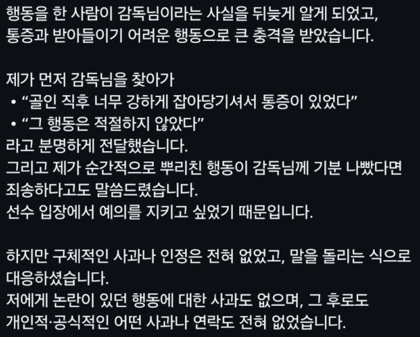 김 감독과 나눈 이야기도 공개했다. 이수민은 “그때는 상황 파악조차 어려웠고, 이후 그 행동을 한 사람이 감독님이라는 사실을 뒤늦게 알게 됐다. 통증과 받아들이기 어려운 행동으로 큰 충격을 받았다”라며 “먼저 감독님을 찾아가 ‘골인 직후 너무 강하게 잡아당기셔서 통증이 있었다’, ‘그 행동은 적절하지 않았다’라고 분명하게 전달했다. 그리고 제가 순간적으로 뿌리친 행동이 감독님께 기분 나빴다면 죄송하다고도 말씀드렸다. 선수 입장에서 예의를 지키고 싶었기 때문”이라고 덧붙였다.
