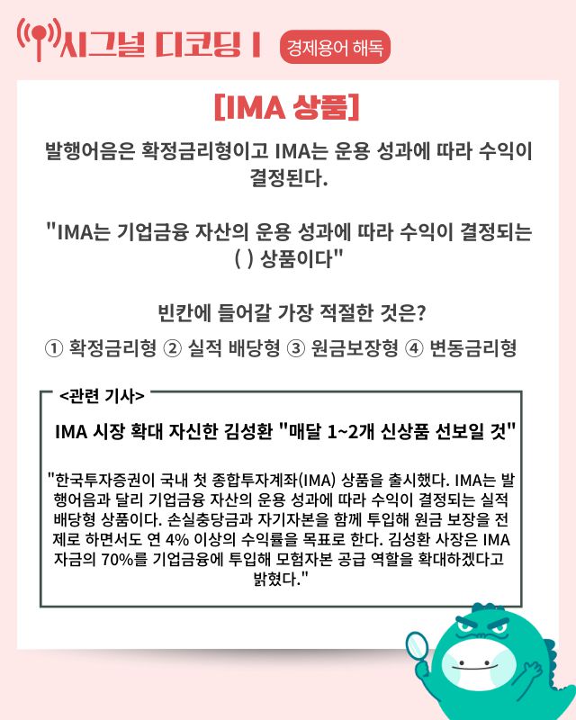 한국투자증권이 국내 첫 종합투자계좌(IMA) 상품을 출시했다. 김성환 사장은 IMA 사업을 국내 자본시장 구조를 바꾸는 전환점으로 규정했다. IMA는 고객 자금을 기업금융과 모험자본에 연결하면서 원금 보장을 전제로 하는 실적 배당형 상품이다. 1호 상품의 기준 수익률은 연 4%로 제시됐다. 한국투자증권은 IMA 자금의 약 70%를 기업금융에 투입할 계획이며, 매달 1~2개의 상품을 출시하겠다고 밝힌 상황이다.
