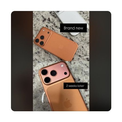 구매 후 2주가 지나면 오렌지색이 핑크빛이나 로즈골드로 변한다는 주장이 주를 이룬다. 변색은 주로 후면 카메라 섬 부분에서 시작해 기기 전체로 번지는 양상이다. 사용자들은 단순한 색감 차이가 아니라 기기 표면이 화학적으로 변질된 것처럼 보인다고 입을 모았다.